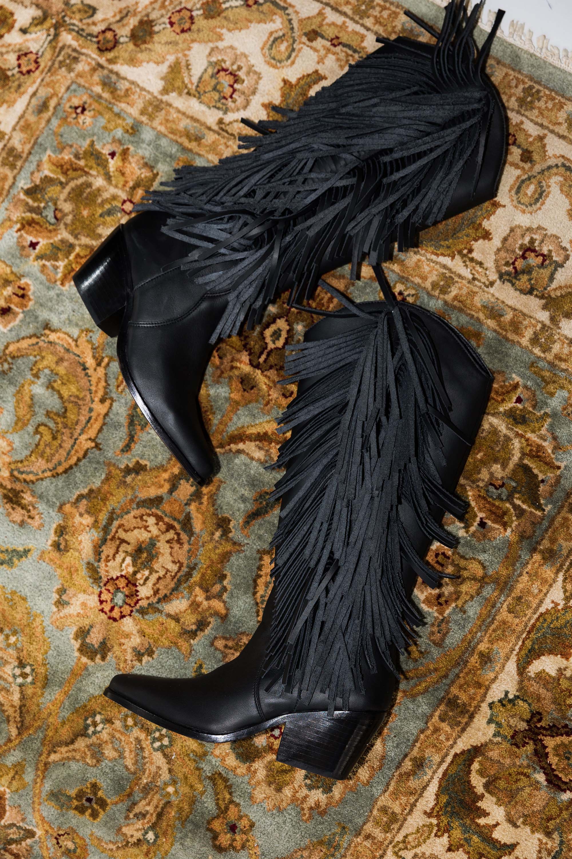 Showstopper boots? Now in BLACK! Meet Ely Black, our knee-high boots detailed by hand. Black fringe along the side and internal zipper. A classic color in our favorite silhouette this season.